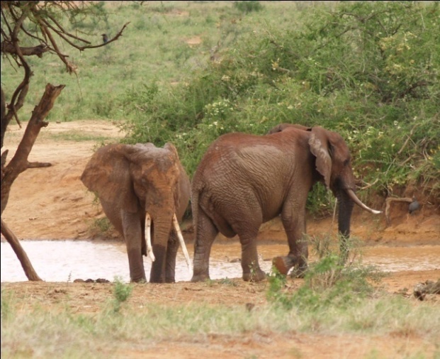 Between September and October, most families were comprised of one adult female and her one or two offspring, a typical family structure in Tsavo. In September, a pipe burst from the water pipeline creating a small lake. Many small families traveled from the bush to this water source, joined other small families, drank then the families split and each family would return to the bush in a different direction. Ambrosia and her female calf were near Voi Riverine in early-July. Sixteen days later, they had moved 20 kilometers northwest to Irima. In mid-September, they had moved 12 kilometers north to Mudanda Rock. Many families from the Hill Clan move between these same areas seasonally. Nola’s family and Nutmeg’s family are often together. They were together in May and June, but in November, Nola was alone, without her offspring or Nutmeg’s family, traveling on the road headed to a waterhole where several families were drinking. She had broken off part of her right tusk since the last sighting. She joined a bull for a short time at the waterhole, photo left. After drinking and splashing, she headed north alone, possibly in the direction her family had traveled.